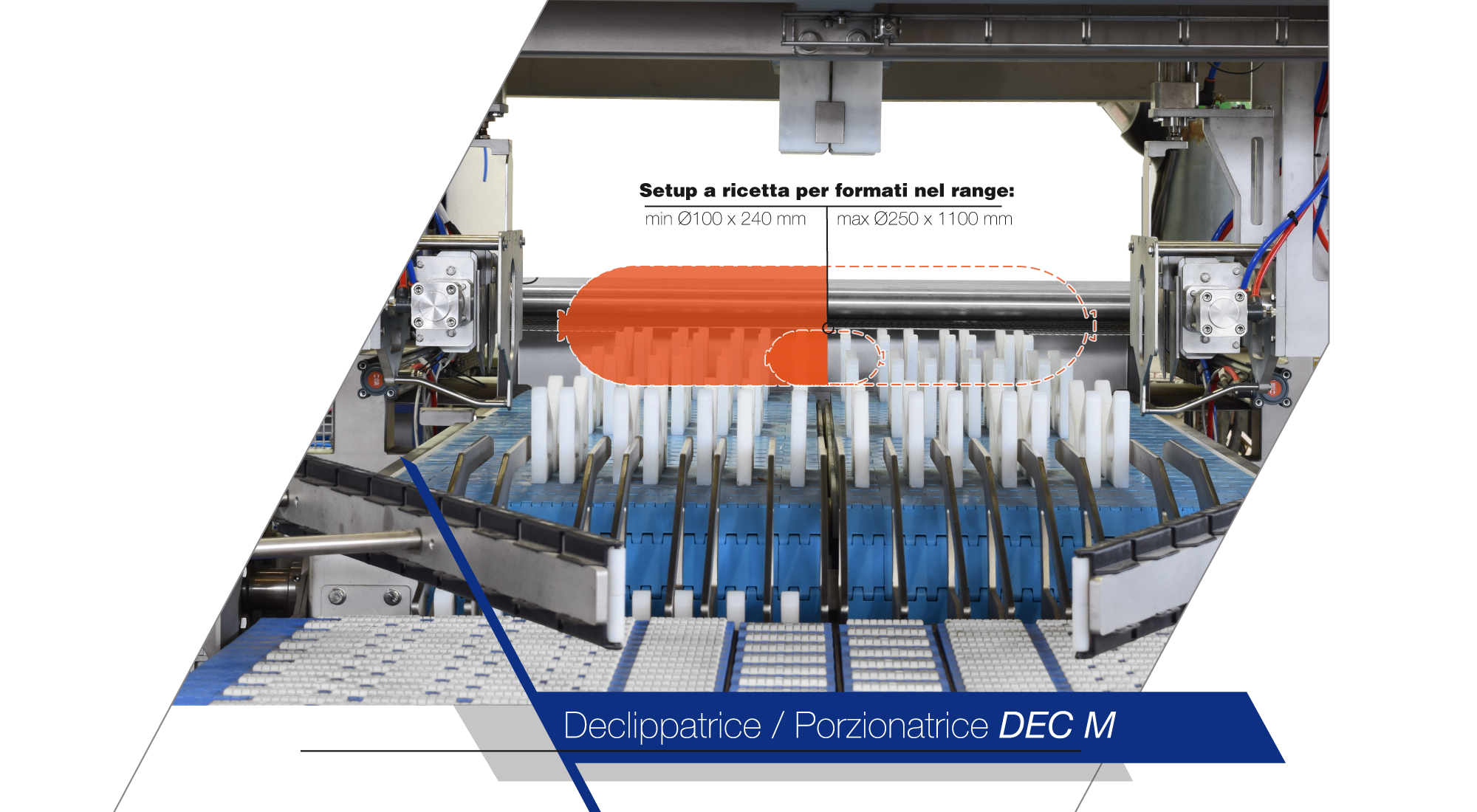 Il prodotto intero entra attraverso il nastro trasportatore della declippatrice, viene centrato e, a seconda della ricetta precedentemente impostata, vengono tagliate e rimosse le clip laterali e il prodotto viene porzionato in due metà identiche.